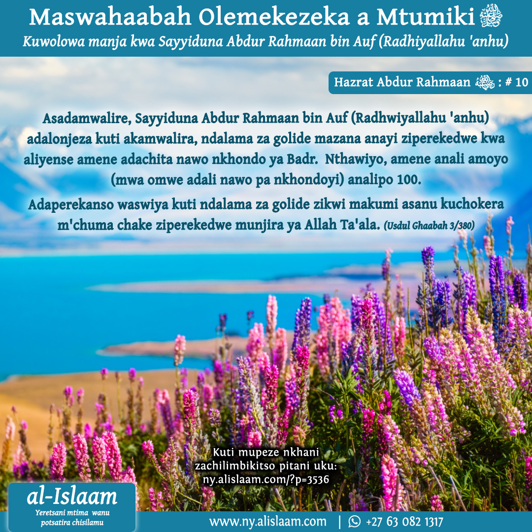 Rasulullah (Swalla Allaahu ‘alayhi wa aalihi wasallam) adati: “Ndithu, amene angadzasamalire akazi anga ndikadzamwalira, ndiye munthu owona ndi owopa Allah.