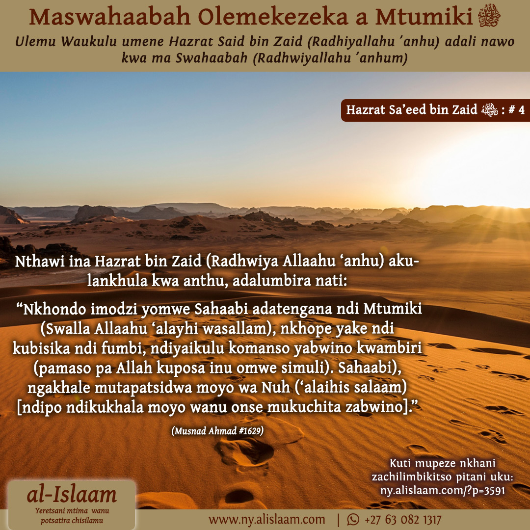 Sa’eed bun Zaid (Radhiyallahu ‘anhu) adakwiya kwambiri ndipo adamutcha Hazrat Mughiirah (radhwiyallahu ‘anhu) dzina lake katatu kuti, “Iwe Mughiirah bun Shu’bah! Iwe Mughiirah bun Shu’bah! Iwe Mughiirah bun Shu’bah!” Kenako adati: “N’chifukwa chiyani ndikumva maswahaaba a Mtumiki (Swalla Allaahu ‘alayhi wa aalihi wa sallam) akunyozedwa pamaso panu, inu mukungokhala chete osamuletsa munthuyo?” Ndikuchitira umboni kuti ndidamva Mtumiki (Swalla Allaahu ‘alayhi wa aalihi wasallam) akutchula Hadith (yokhudza ma Swahaabah ake). Ndidamva Hadith imeneyi ndi makutu anga. Mtima wanga udasunga mawu amenewo, sindidzapachika bodza lieilonse ma swahaabah radhwiyallah anhu lomwe lidzapangitse kuti adzandifunse pa tsiku la Qiyaamah.