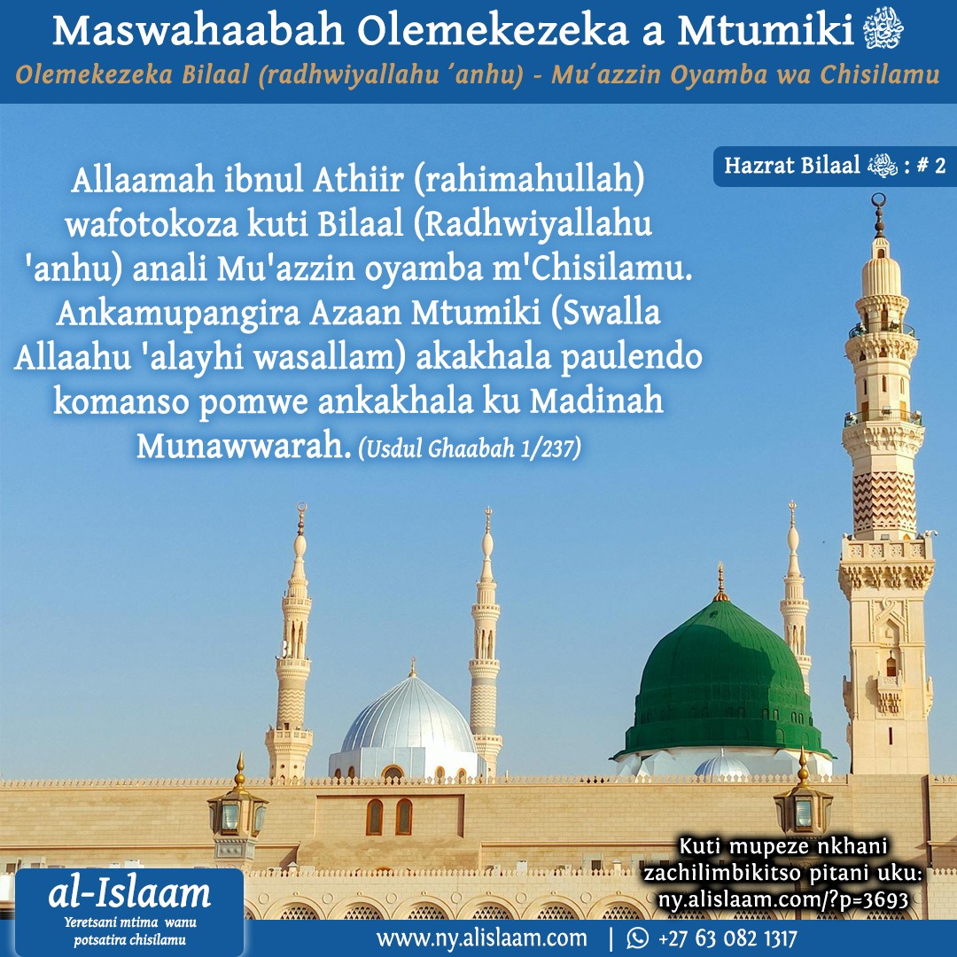 “Mtumiki (sallallahua alaih wasallam) atapanga Hijrah (atasamukira) kupita ku Madina Munawwarah adamanga nzikiti. Atamanga nzikiti adakambirana ndi ophunzira ake nkhani yopezera njira imene angamawaitanire anthu kuti adzaswali. Lidali Khumbo la Mtumiki (sallallahu alaih wasallam) kuti anthu adzisonkhana ndikuswalira pamodzi munzikiti. Mtumiki (sallallahu alaih wasallam) sankasangalatsidwa kuti masahabah adzaswali aliyense payekha payenkha munzikiti ngakhalenso m’nyumba zawo.
