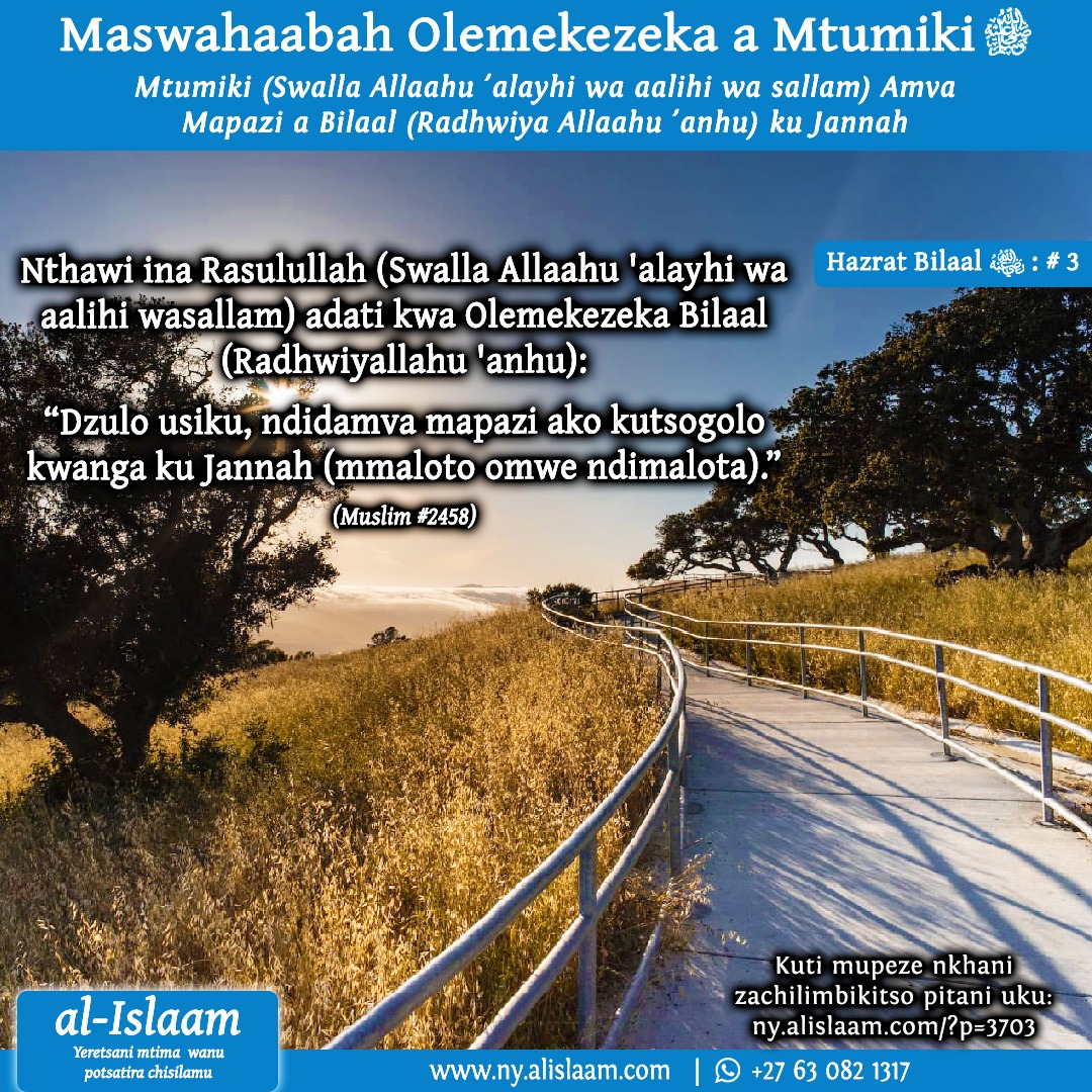 Olemekezeka Abu Hurairah (Radhwiya Allaahu ‘anhu) akusimba kuti nthawi ina, nthawi ya Swalah ya Fajr, Mtumiki (Swalla Allaahu ‘alayhi wa aalihi wasallam) adati kwa Bilaal (Radhwiyallahu ‘anhu): “E, Bilaal! Pa ntchito zabwino zomwe umachita mchisilamu, ndi ntchito iti yomwe imakulimbikitsa kuti udzapindula nayo pa tsiku lachiweruzo,chifukwa usiku wapitawu ndamva kuyenda kwa mapazi ako ku Jannah (ku maloto).