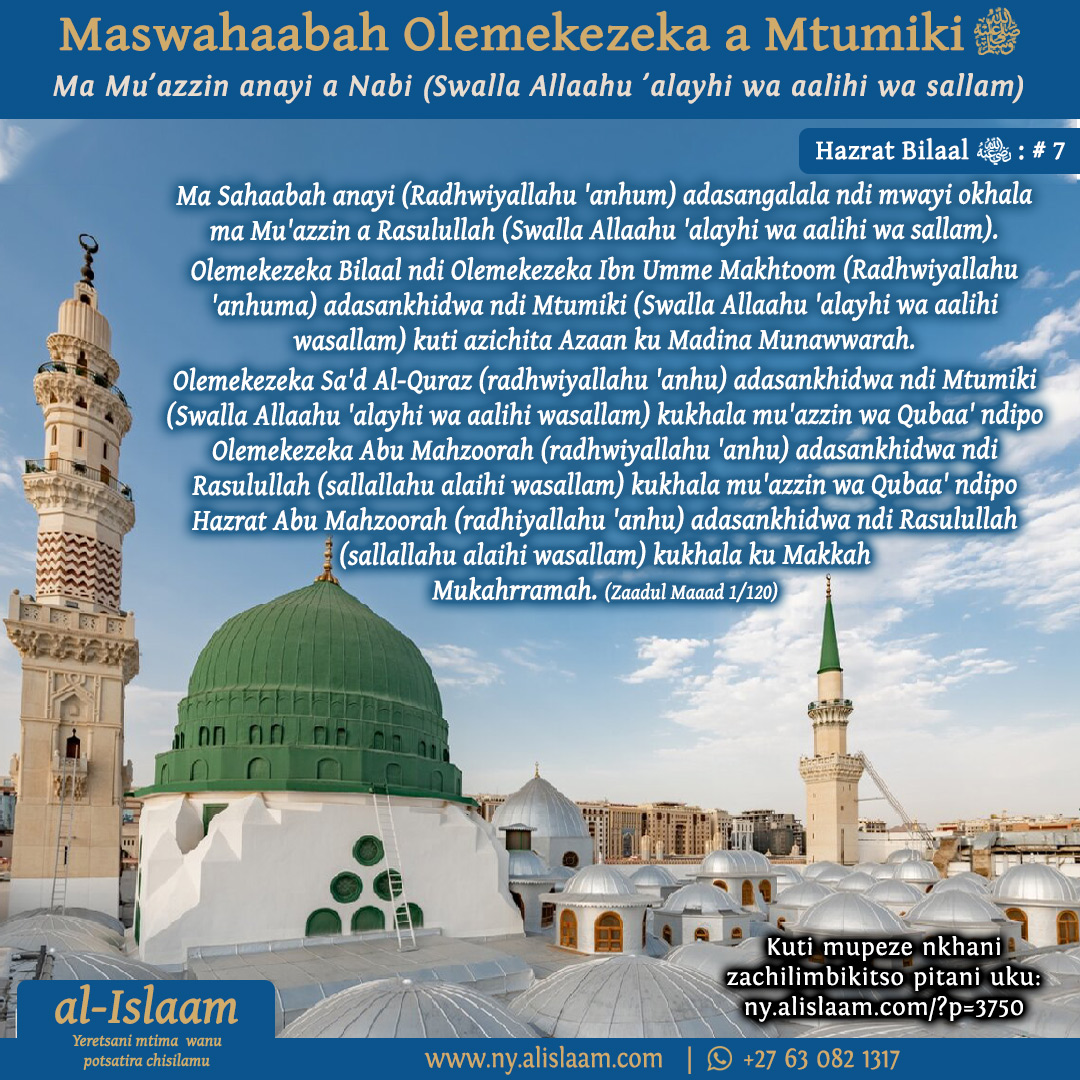 Pambuyo pogula Hazrat Bilaal (Radhiya Allaahu ‘anhu), Hazrat Abu Bakr (Radhiya Allaahu ‘anhu) adadza kwa Nabiy (Swalla Allaahu ‘alayhi wa aalihi wa sallam) ndipo adamuuza za kugula. Nabiy (Swalla Allaahu ‘alayhi wa aalihi wa sallam) adamufunsa Hazrat Abu Bakr (radhwiya Allahu ‘anhu) kuti amupangane kukhala bwenzi mu umwini wa Hazrat Bilaal (Radhiyallahu ‘anhu) pomulola kuti agule gawo mwa iye.” (Nabiy (Swalla Allaahu ‘alayhi wa aalihi wa sallam) adafuna kugawana nawo mu umwini wa Hazrat Bilaal (Radhiya Allaahu ‘anhu) kugawana nawo gawo pamene adamumasula Hazrat Abu Bakr (radhiyallahu ‘anhu), adayankha kuti adamumasula kale Hazrat Bilaal (Radhwiyallahu ‘anhu).