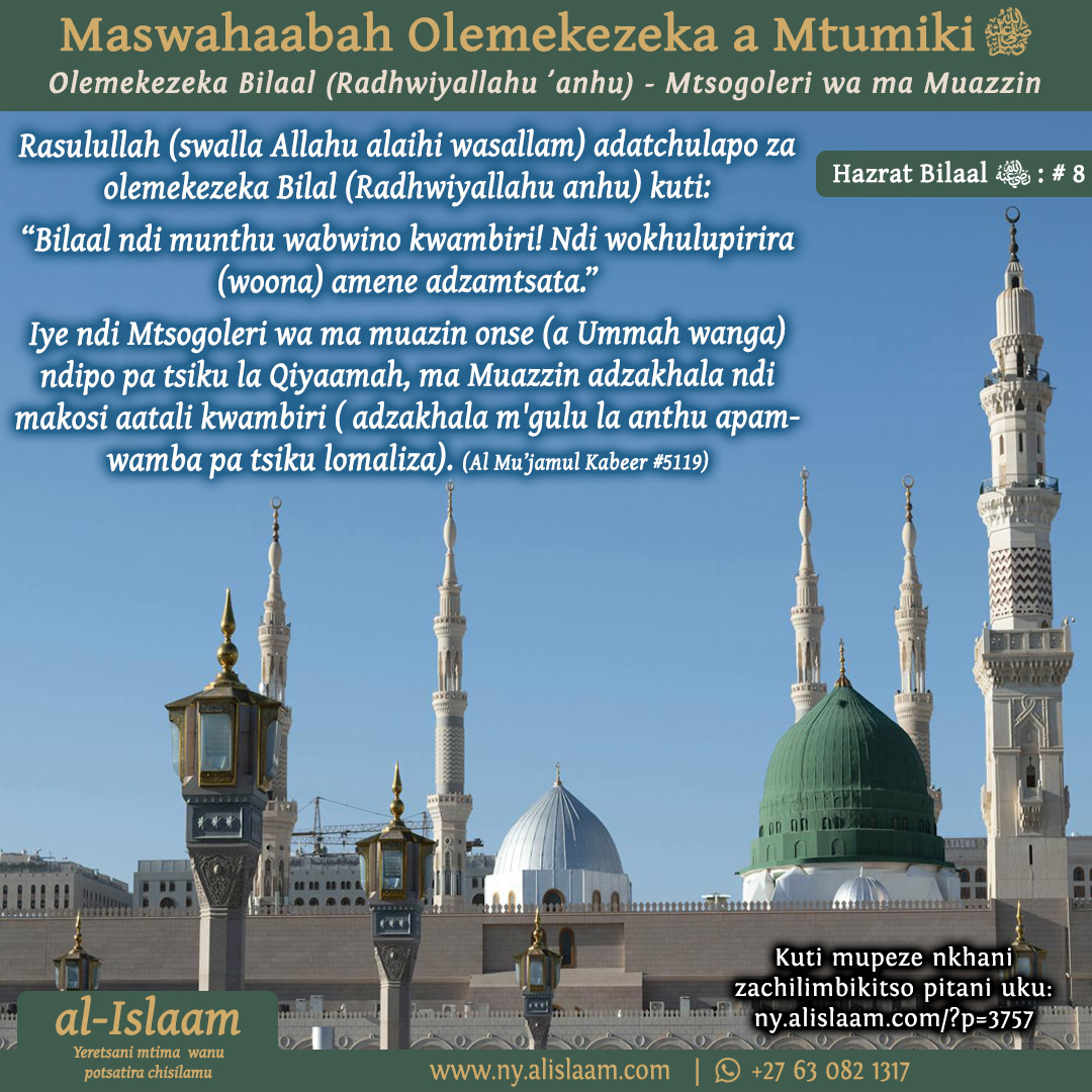 Mtumiki (Swalla Allaahu ‘alayhi wa aalihi wa sallam) atachoka pa dziko lino lapansi ndipo Abu Bakr (Radhwiyallahu ‘anhu) atasankhidwa kukhala khalifah, Bilaal (radhwiya Allahu ‘anhu) amachitanso chimodzimodzi kwa Abu Bakr (radhiyallahu ‘anhu) masiku a Eid. (Siyar A’laam Nubalaa’ 3/221).
