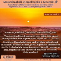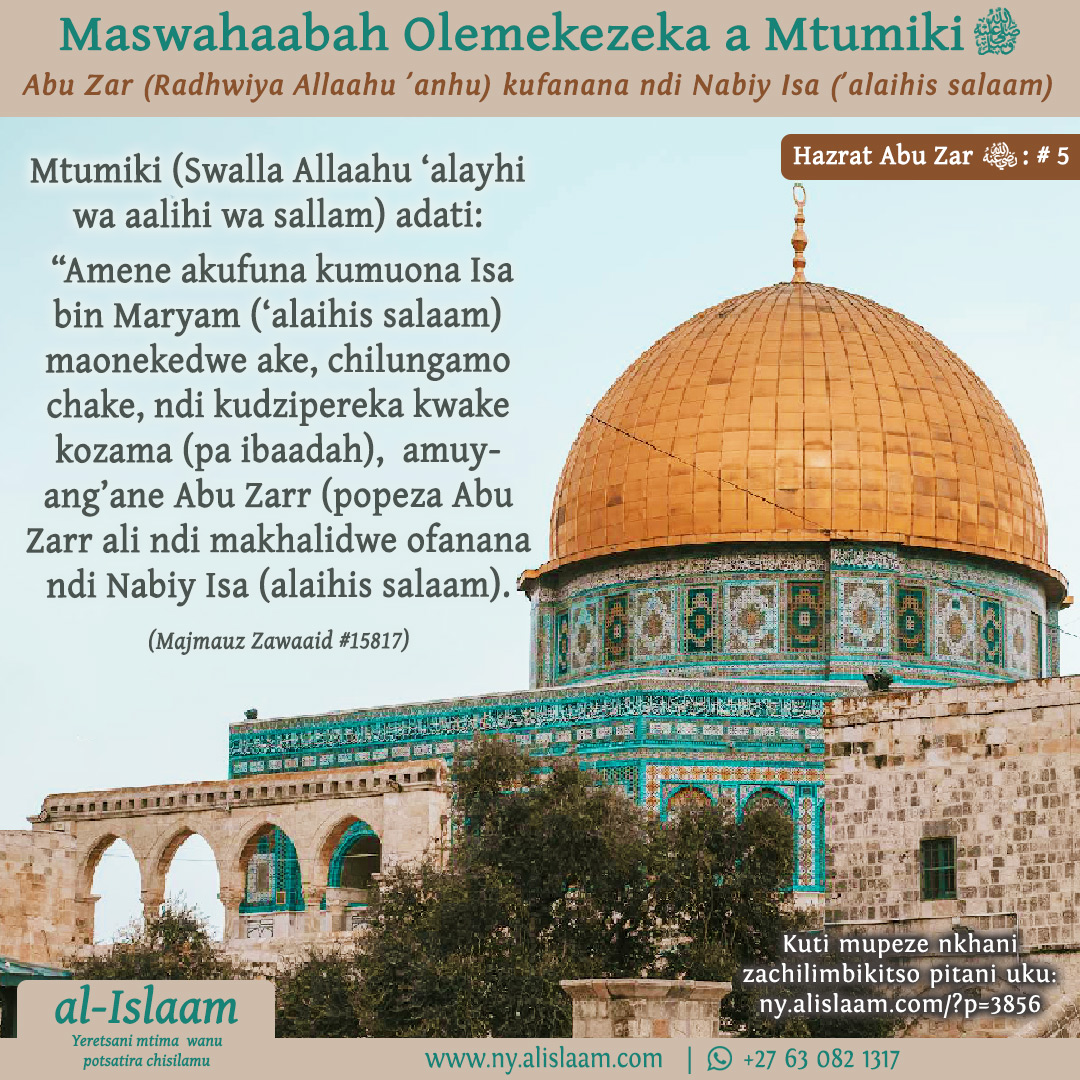 Rasulullah (sallallahu ‘alaihi wasallam) anati, “Aliyense amene akufuna kumuona Isa bin Maryam (‘alaihis salaam) Taqwa yake, chilungamo chake, ndi kudzipereka kwake (pa ibaadah), ayenera kumuyang’ana Abu Zar” (Majmauz Zawaaid #15817)