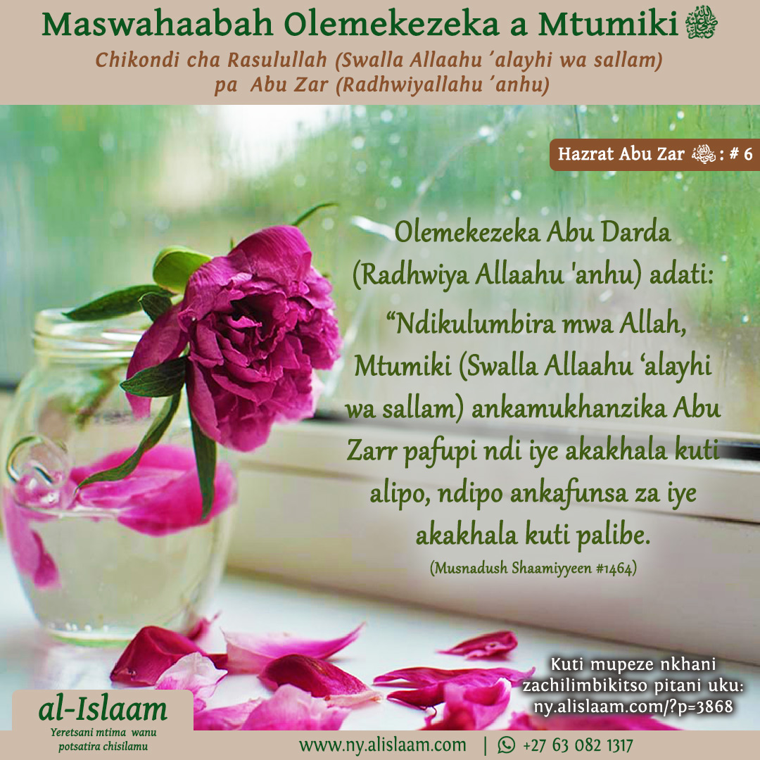 Kenako Rasulullah (Swallallahu ‘alaihi wasallam) adati, “Udzachita chiyani ukadztulutsidwa m’menemo ( Madinah Munawwarah kachiwiri)?” Abu Zar (radhwiyallahu ‘anhu) anayankha kuti, “Ndidzachite chiyani, Ee Nabi wa Allah? Ndikanthe ndi lupanga langa (ndi kumenyana ndi amene akufuna kunditulutsa)?”
