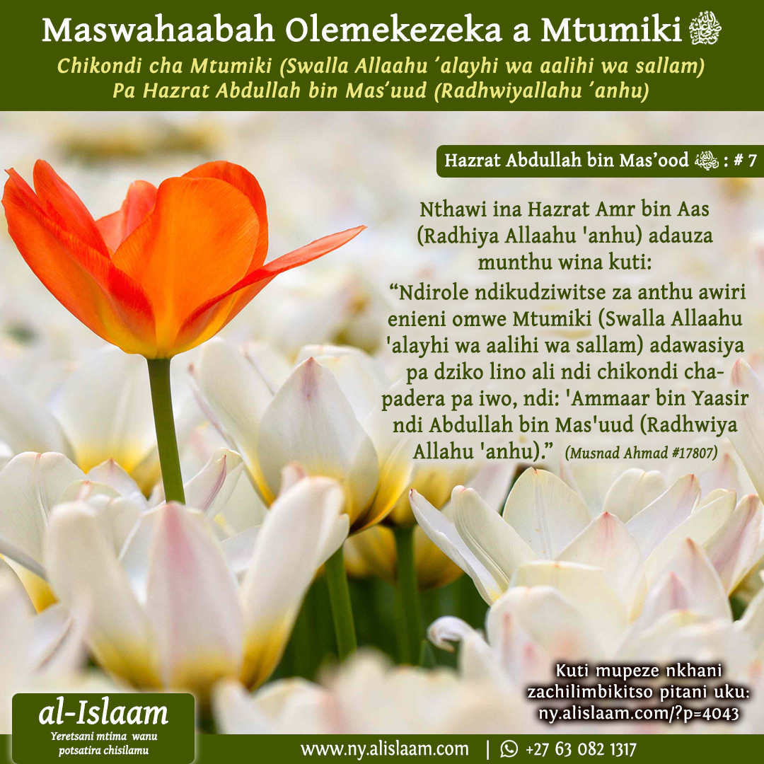 Nthawi ina, Rasullullah (Swallallahu alaihi wasallam) anabwera ku fuko la Bani Zafar (fuko lachi Ansaar). Ali pa mimbar akulankhula nawo, anamuuza Abdullah bin Mas’ood (radhwiyallahu ‘anhu), kuti, “Ndiwerengere Quraan.”